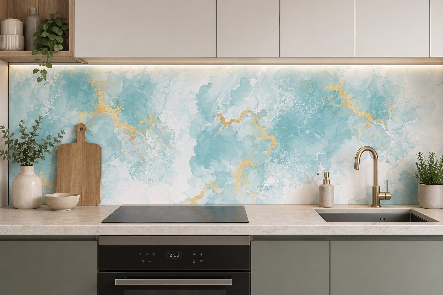 Le motif marbre vert aux veines dorées bénéficie d’une impression numérique haute définition réalisée dans notre atelier de Montpellier. Nous utilisons des encres sans solvant qui assurent une restitution précise des détails minéraux et une excellente tenue des teintes. Ce choix technique garantit un produit stable qui résiste aux projections quotidiennes et se nettoie simplement avec un chiffon doux et de l’eau savonneuse. La surface lisse empêche l’incrustation des salissures, rendant l’entretien plus rapide au quotidien. Le rendu visuel net transforme l’aspect de votre zone de cuisson immédiatement après la pose sans attendre de temps de séchage ni de finitions complexes.