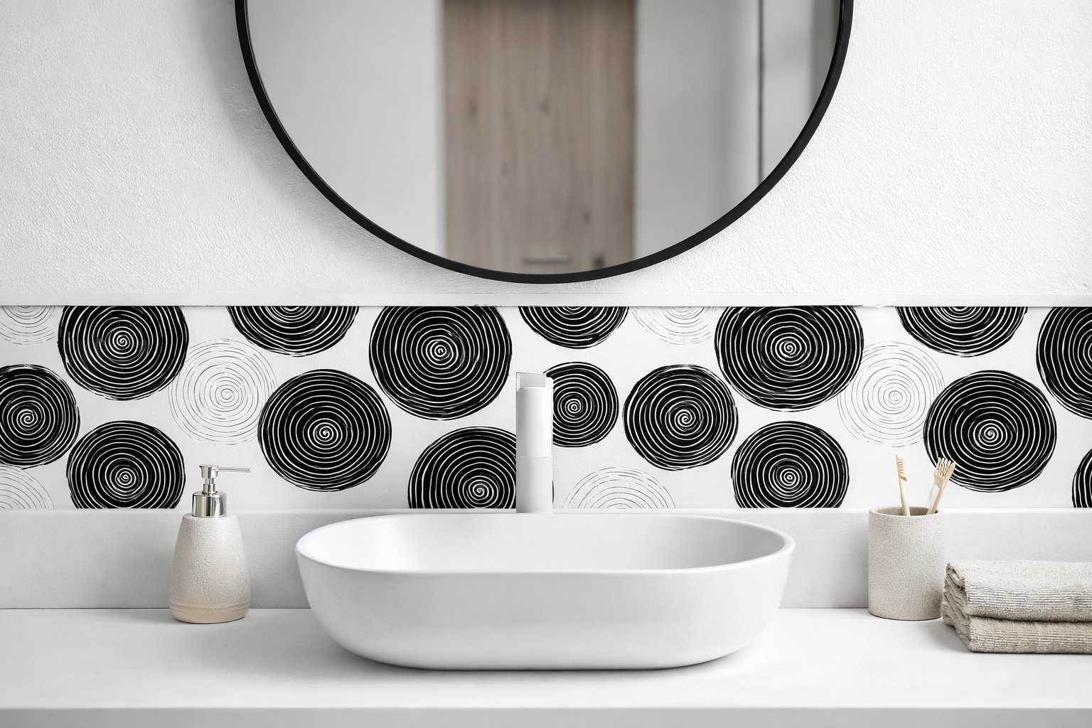 Fabriquée à partir de matériaux robustes et de haute qualité, la crédence cercle noir et blanc est pensée pour durer. Elle offre une excellente résistance à l’humidité et aux taches, tout en conservant son allure élégante. Un investissement intelligent pour rehausser votre salle de bain.