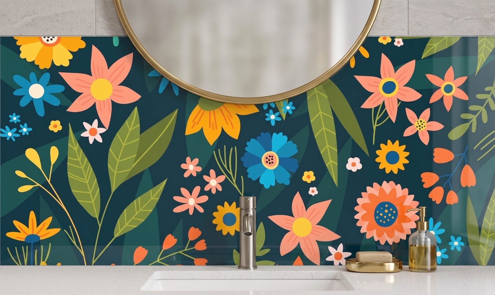 Apportez une touche de sophistication et de charme à votre salle de bain avec notre Crédence de Vasque – Floral Couleur – Fond-Nuit. Le design floral raffiné sur un fond sombre crée une ambiance chic et intemporelle qui transforme instantanément votre espace.