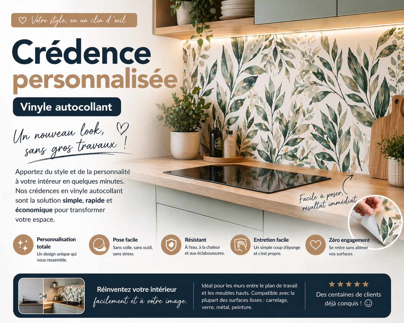 Ajoutez une touche d’élégance et de personnalité à votre cuisine ou salle de bain grâce à notre crédence personnalisée en vinyle autocollant. Conçue pour s’harmoniser avec votre goût et votre décoration, elle est idéale pour créer des espaces uniques qui reflètent votre caractère.