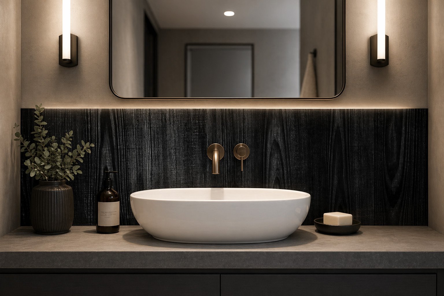 Adoptez la crédence Vasque Bois Noir pour une salle de bains qui allie beauté et praticité.