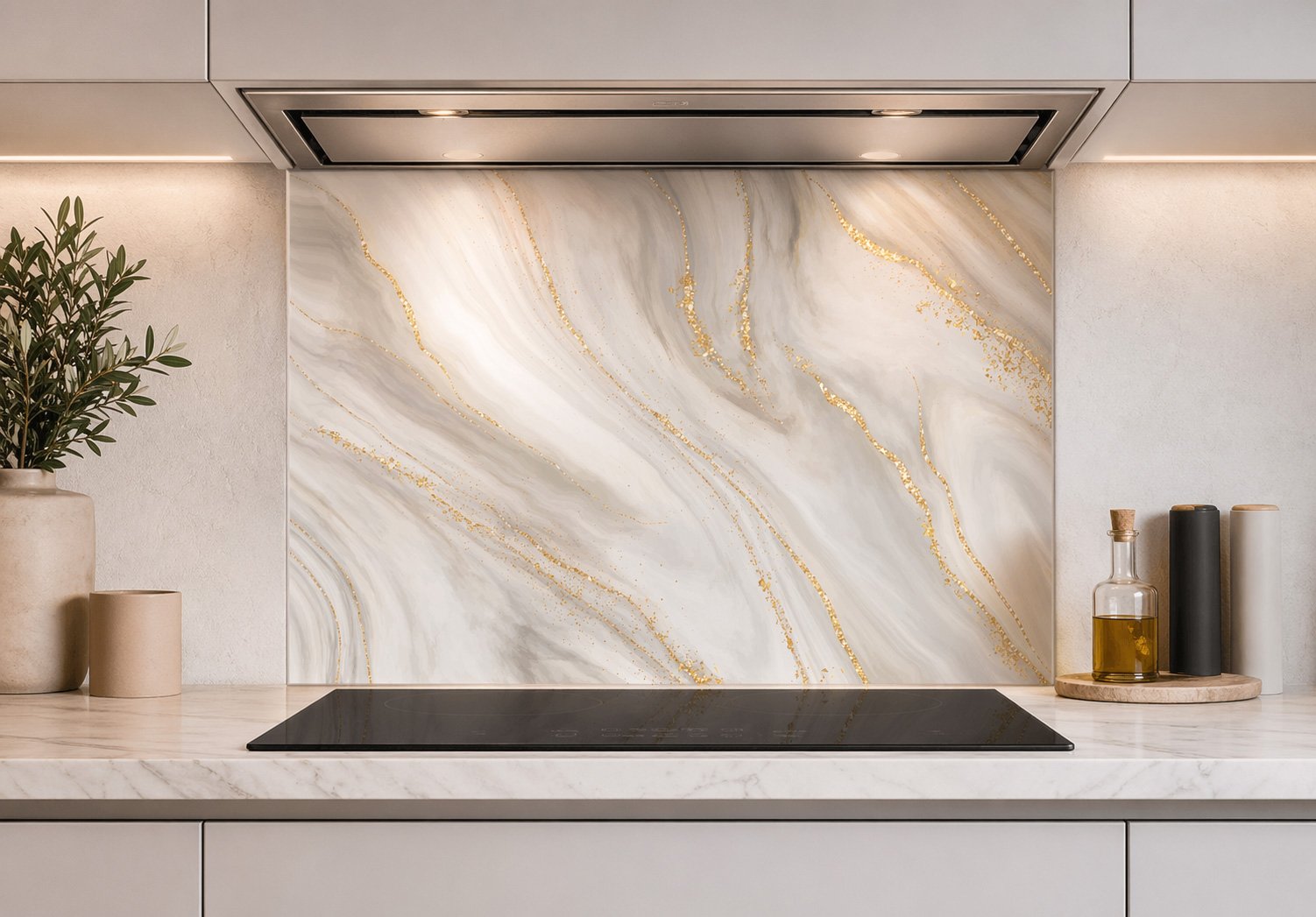 Transformez votre cuisine avec le fond de hotte marbre Beige Doré & Gris. Ce modèle époustouflant présente une finition marbrée aux nuances de beige, doré et gris, offrant une esthétique contemporaine et raffinée qui s’adapte parfaitement aux décors modernes.