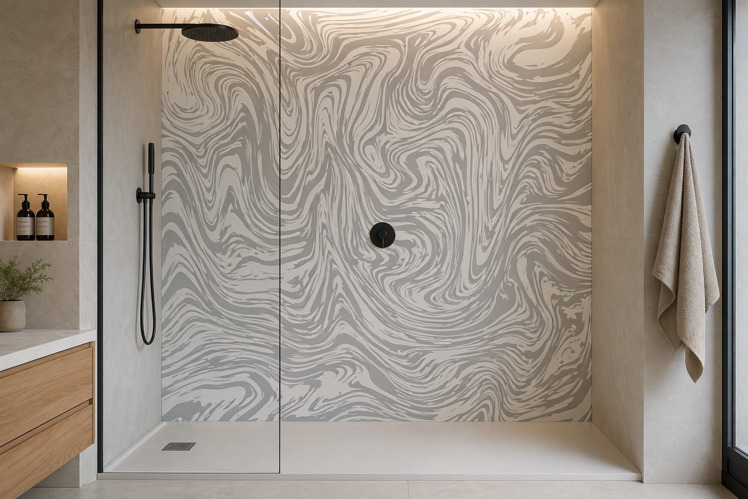 Découvrez le panneau de douche en marbre liquide gris, conçu pour apporter une touche de modernité et de raffinement à votre espace. Son fini doux et son esthétisme épuré s’intègrent parfaitement dans tout type de décoration intérieure.